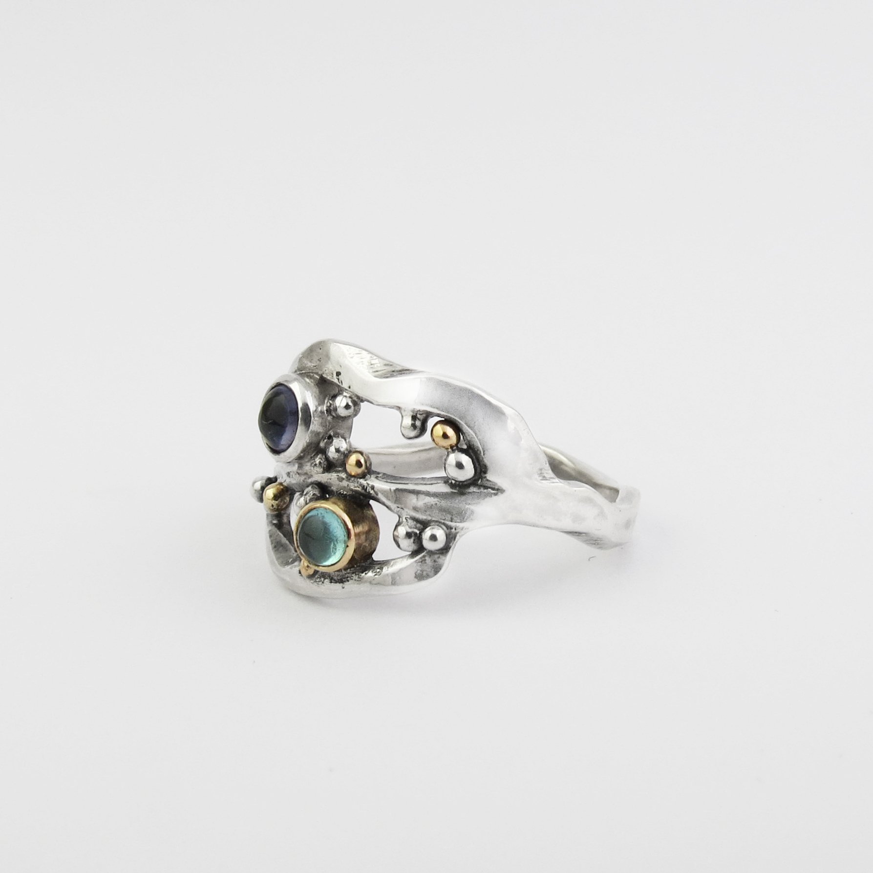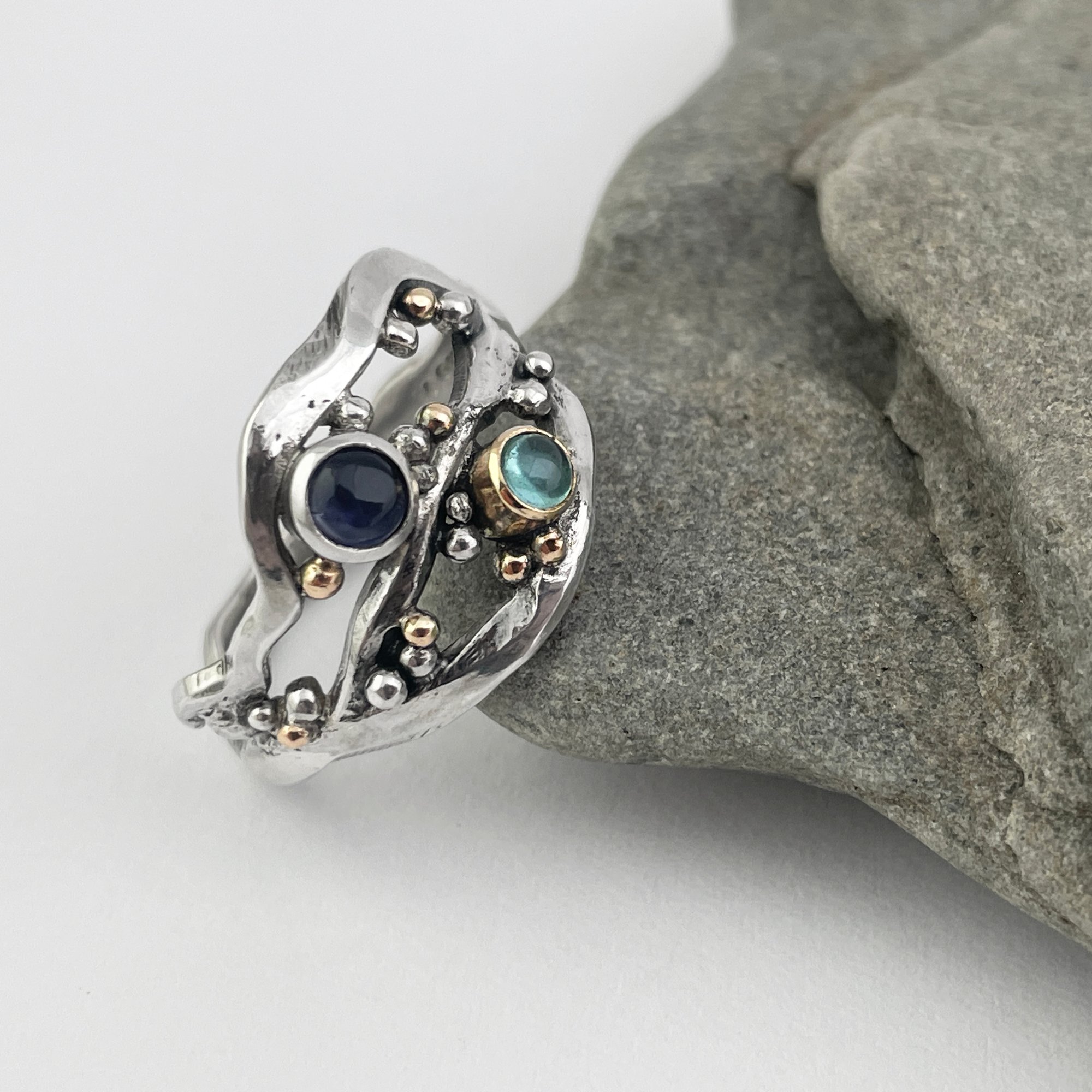 This Silver and 9ct Gold River Ring is a one-of-a-kind piece, set with Iolite and Apatite cabochons. It has been shaped from offcuts of the wiggly-edged River Kilt Pins, giving it an organic, flowing form that reflects the movement of water. The band is studded with rocky silver and gold granules, reminiscent of stones and pebbles caught between layers of river bedrock. Each ring is shaped around a different stone and guided by the character of the silver itself, making every River Ring completely unique.