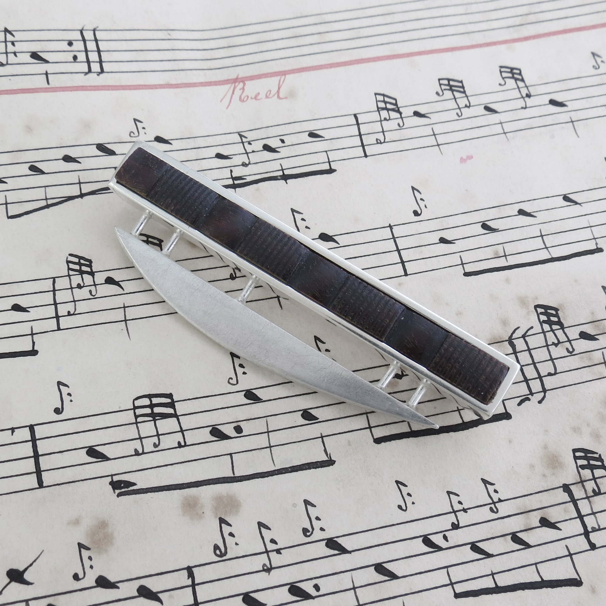 Sterling Silver and reclaimed drone wood brooch with original bead and comb work. Inspired by the iconic shapes and sounds of the great highland bagpipe.