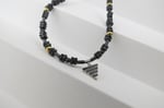 A single Silver Delta hung on faceted square slice, round and tube shaped Hematite beads with Rolled Gold bead detail.