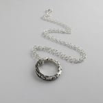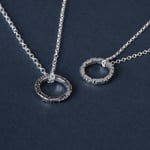 Adorned with a geometric pattern of notches and lines combined with an organic hammer texture, this solid silver hoop pendant holds a secret meaning for the wearer and those that know.